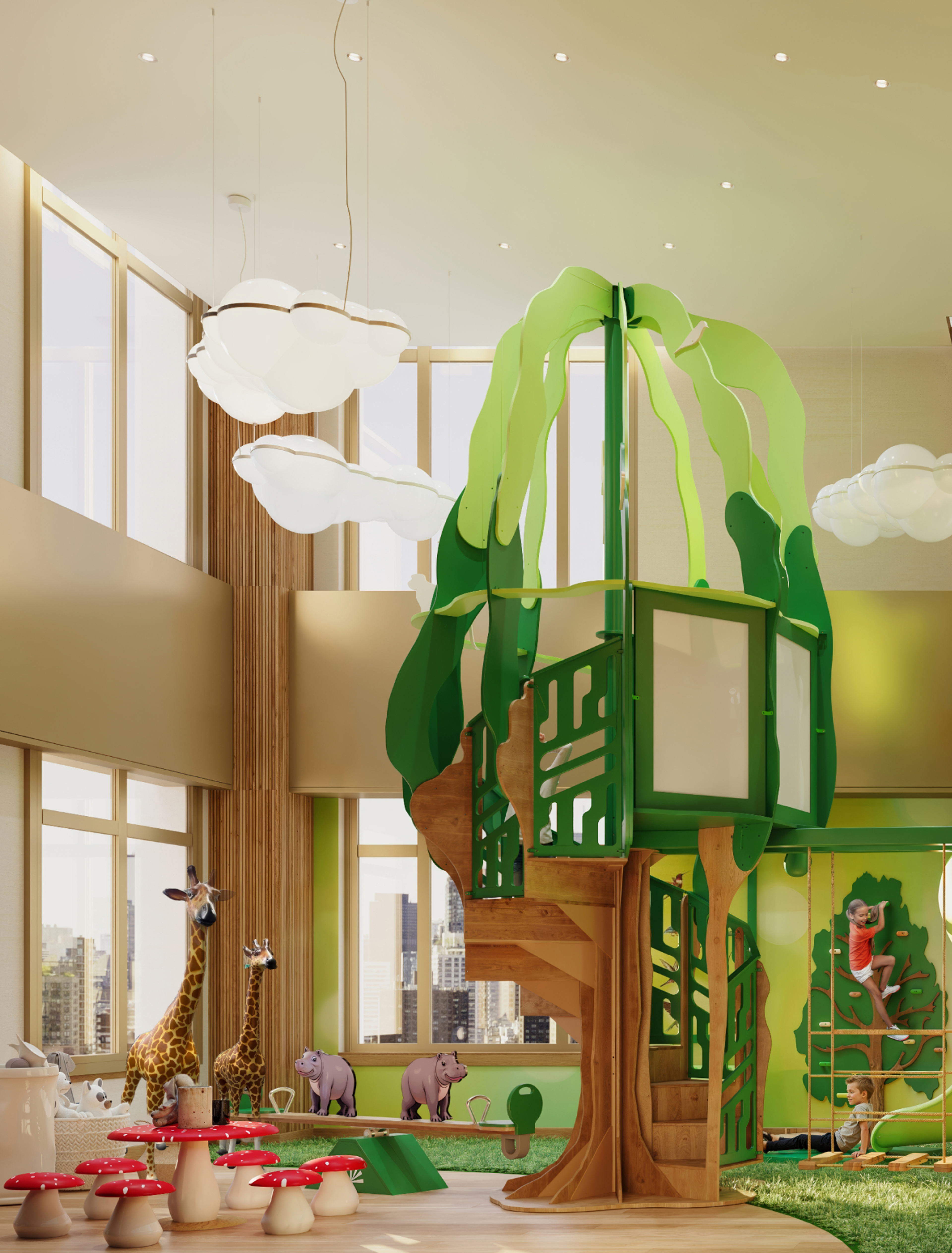A theater and an inspirational children’s playroom encourages creativity and personal expression. A stunning rooftop lounge, and terrace fit with a fire pit and beautiful pergola offer breathtaking views over Central Park, New York, and the East River.